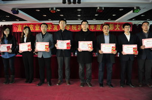 春回大地,万物竞发。3月23日下午,吉林农业大学发展学院2011年度表彰大会在六楼报告厅举行。大会对上年在教学、科研和管理等各项工作中取得突出成绩的单位、部门、团队和个人进行了表彰,指明了2012年的工作目标和达成目标的要求、措施。校长兼党委书记宗占国,副校长栾玉振、赵中岳、李华楠、王艳梅,校长助理孙加工、高杰、毕庆三,财务总监刘亚力等领导出席,近400名教师与会。