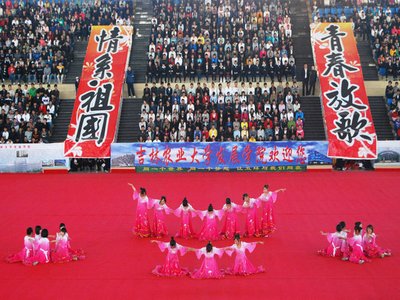 9月23日14时整,吉林农业大学发展学院体育馆座无虚席,全体2009级新生都沉浸在这喜庆、祥和的气氛中。由校团委主办,校社团联合会、校大学生艺术团协办的“迎新生 庆国庆”大型文艺演出在此隆重举行。观看演出的领导有:吉林农业大学发展学院党委副书记李华南,副校长王艳梅以及各分院、处室的领导和老师等。