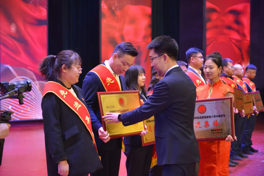 宣读文件后,张电达向捐赠企业代表、家长代表颁发了捐赠证书。与会领导依次为抗击新冠疫情优秀志愿者、先进个人、先进集体代表和“抗击新冠疫情特殊贡献奖”荣誉称号获得者颁发了证书、奖杯、奖牌。