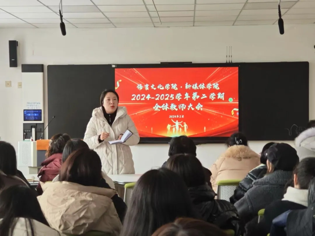 为明确新学期发展目标,科学部署开学准备工作,确保新学期各项工作有序开展,2025年2月25日13:30,语言文化学院·新媒体学院在第一教学楼316多媒体教室召开全体教师大会。此次会议由语言文化学院·新媒体学院陈院长主持,副院长王巍及全体教师参加此次会议。