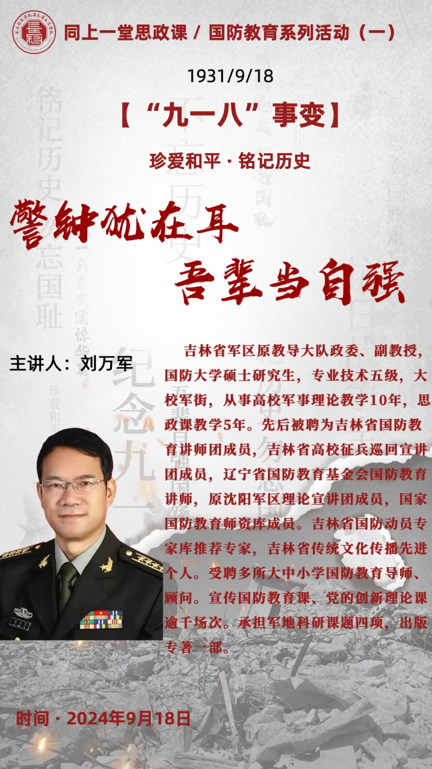 历史是最好的教科书,也是最好的清醒剂。今天是九一八事件93周年纪念日,为缅怀烈士功德,悼念先辈英灵。刘教授以“警钟犹在耳,吾辈当自强”为主题,分别从“铭记历史教训,不让悲剧重演”、“强国必强军,有国才有家”、“新时代、新征程,勇担新责任”三方面向同学详细讲解。引导学生勿忘国耻、以史为鉴,厚植爱国之情、激发强国之志,以天下为己任,为祖国的繁荣昌盛和民族的伟大复兴不断奋斗,筑牢强国复兴有我的远大志向。