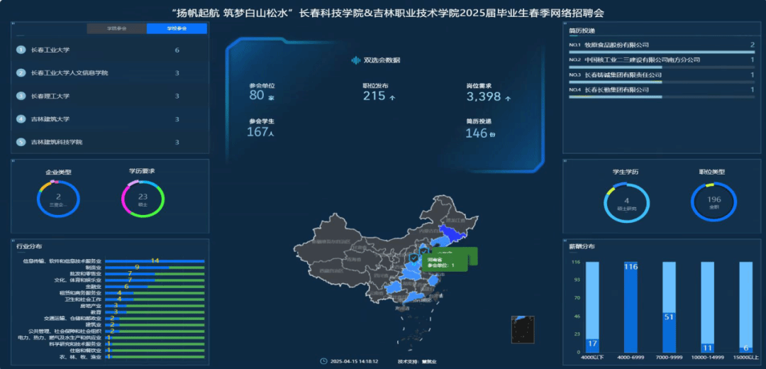 为深入贯彻党中央、国务院关于高校毕业生就业创业的决策部署,全面落实教育部关于开展2025届高校毕业生“春季促就业攻坚行动“的通知要求,按照吉林省委、省政府部署,抢抓春季黄金招聘期,全力促进毕业生更加充分、高质量的就业。由长春科技学院、吉林职业技术学院与慧就业平台合作,于2025年4月15日-18日举办“扬帆起航 筑梦白山松水”长春科技学院2025届毕业生春季网络招聘会(第二场)。