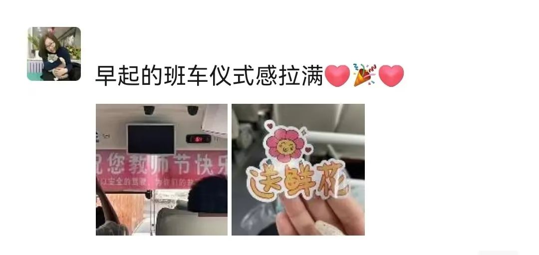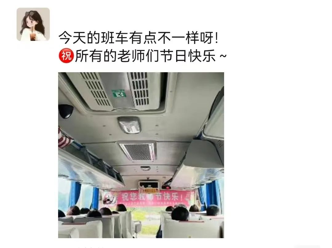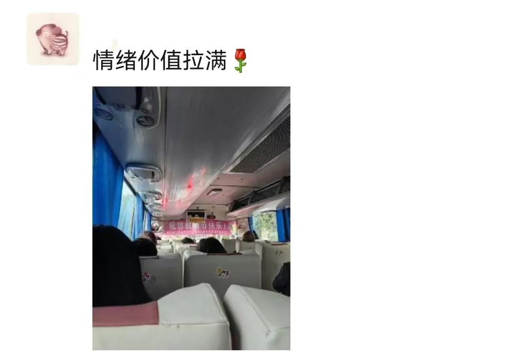 “今天的班车有点不一样!”“暖心的设计,太贴心啦!”班车上不断传来老师们惊喜的声音,原来是学校车队为大家送来了惊喜! 粉红色的条幅写满教师节祝福,每个座椅靠背上都有精心准备的“小心机”:“感恩教师节”“桃李满天下”“老师您辛苦了”“送鲜花”......