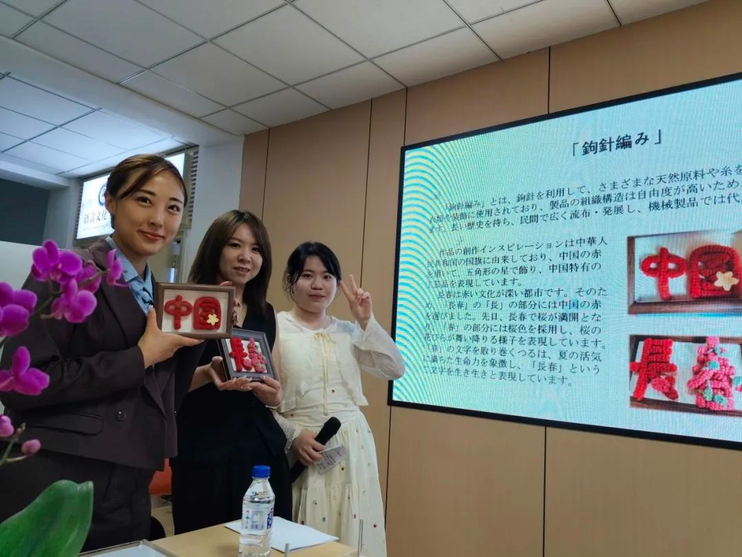学生赠送手工钩织的"中国长春"作品,融合中国红与日本樱花元素;师生共同完成日语版"上善若水(じょうぜんじゃくすい)"书法长卷,展现文化交流。