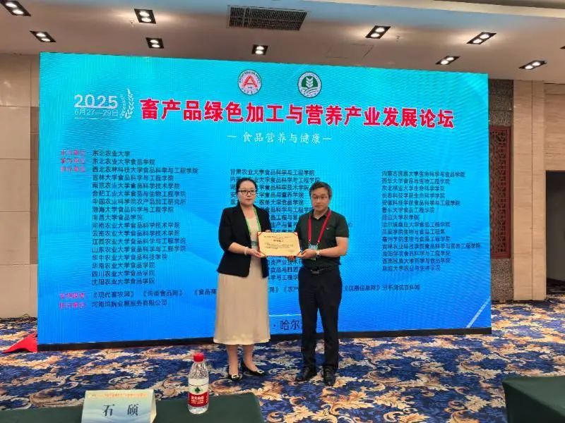 6 月 28 日下午,在 “畜禽产品蛋白质·科学与益生菌及功能乳品、保健品” 分论坛中,唐玉娇教授以《鹿心肽的创制与多维生物活性解析》为题作学术汇报,系统阐述鹿心肽高效制备工艺及抗氧化、免疫调节等生物活性机制,为鹿产品功能化深加工提供技术路径。汇报引发与会专家关注,现场获颁论坛组委会出具的演讲证书,彰显研究成果的学术认可度。