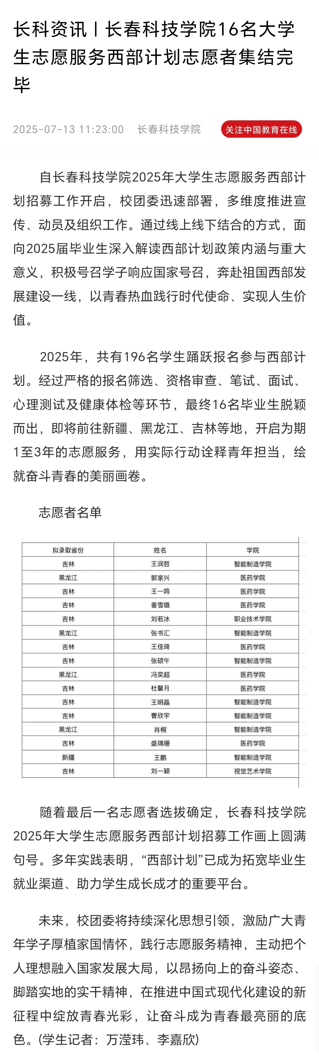 长春科技学院16名大学生志愿服务西部计划志愿者集结完毕