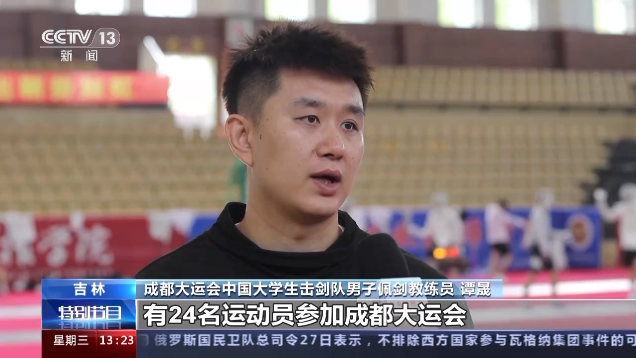 成都大运会中国大学生击剑队男子佩剑教练员 谭晟:中国击剑队有24名运动员参加成都大运会,由来自8个省市12个院校的运动员组成。