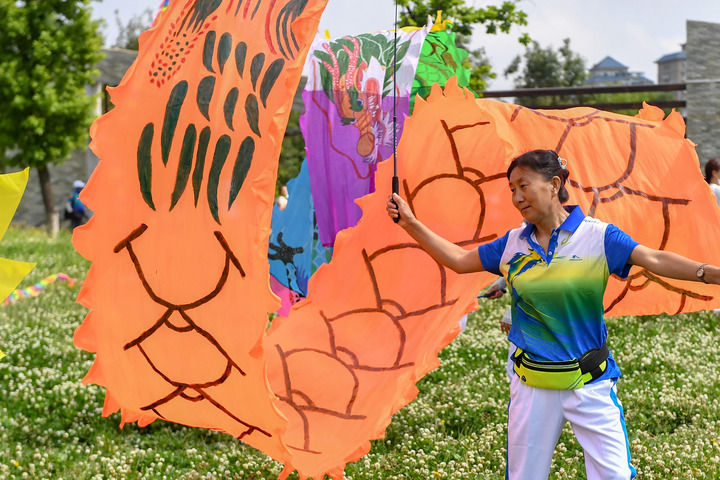 6月22日,市民在吉林省长春市伊通河工业轨迹公园进行龙形彩绸表演。新华社记者 张楠摄