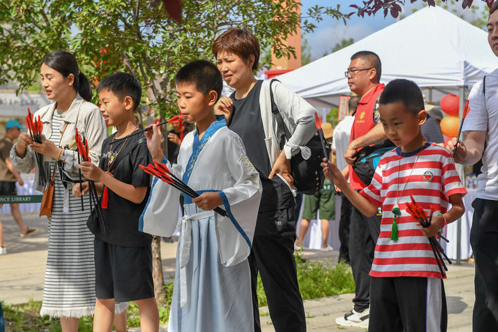 6月22日,小朋友在吉林省长春市伊通河工业轨迹公园体验投壶游戏。 新华社记者 张楠摄