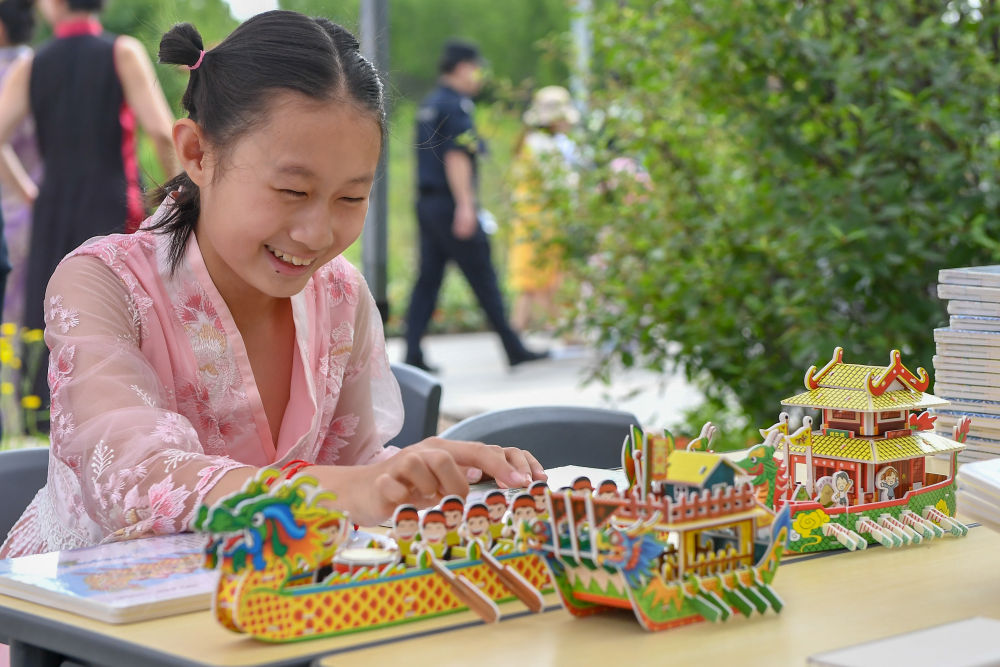 6月22日,小朋友在吉林省长春市伊通河工业轨迹公园体验制作龙舟模型。 新华社记者 张楠摄