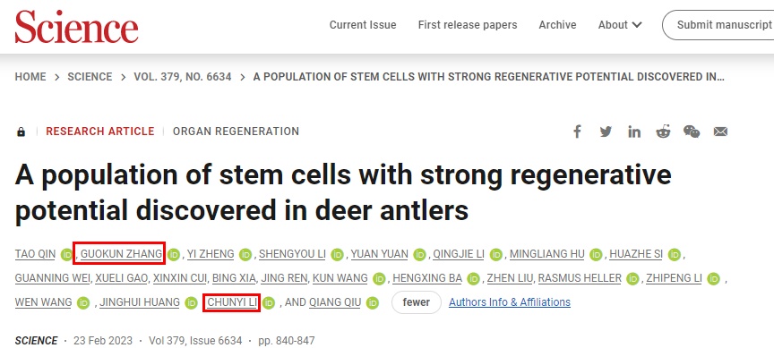 2月24日,长春科技学院鹿茸科学与产品技术研究所(下文简称鹿茸所)李春义教授团队联合西北工业大学邱强教授团队、空军军医大学黄景辉教授团队与吉林农业大学李志鹏教授团队,在国际顶级学术期刊《Science》,在线发表题为“A population of stem cells with strong regenerative potential discovered in deer antlers”的研究成果。该论文是长春科技学院教师首次登顶《Science》期刊,实现了该校乃至双非院校CNS主刊文章零的突破。该论文探索了鹿茸再生机制,描绘出了鹿茸再生的单细胞图谱,为器官再生、再生医学添上了重要的一笔。