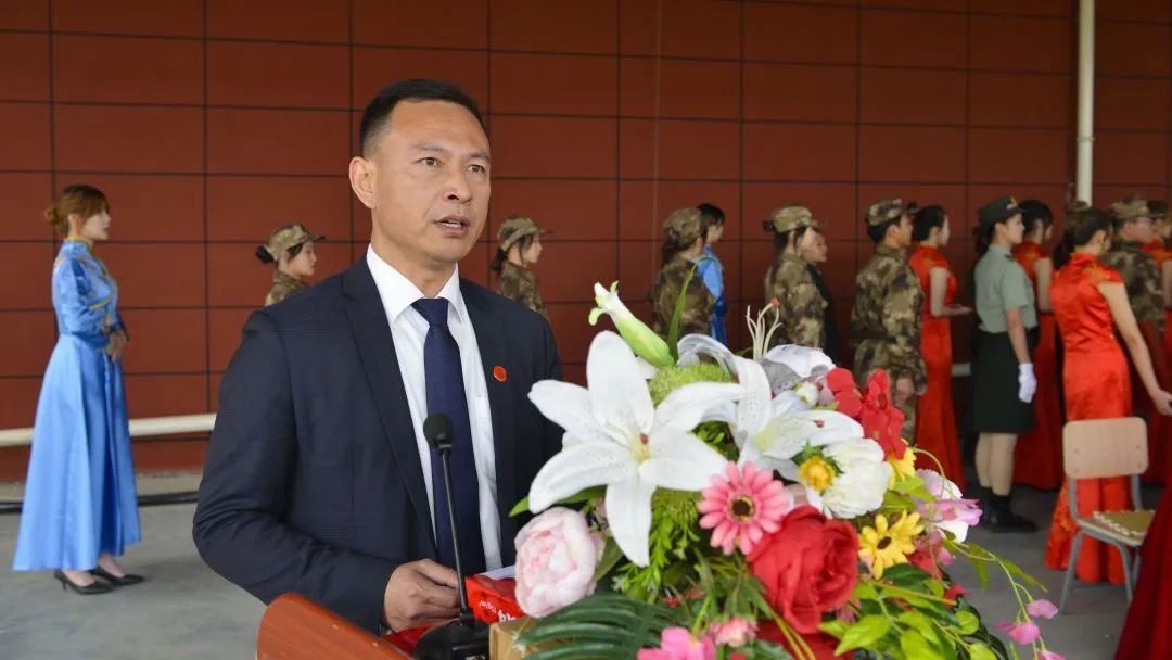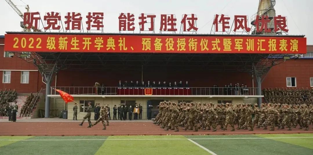 奋斗青春,谱写华章。长春科技学院2022级新生开学典礼、预备役授衔仪式暨军训汇报表演在校体育场举行。东华教育集团董事局主席、长春科技学院董事长张电达,长春科技学院校长栾立明,党委书记林佳彬,副校长盖同祥,党委副书记宋学山,副校长高杰,校长助理刘立东,党委副书记高芳出席。各分院(部)、处室的有关领导、部分教师及全体2022级新生参加。