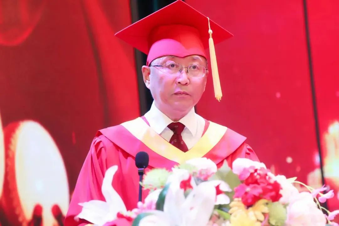 校长栾立明以《求实奋进,继往开来》为题作重要讲话,向圆满完成学业的全体毕业生表示热烈祝贺!向辛勤培育你们的家长和老师表示崇高的敬意。