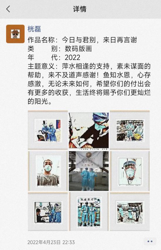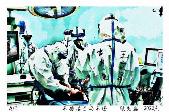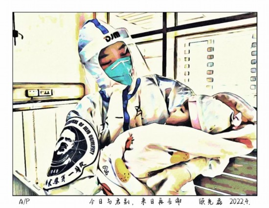 核酸采样、方舱救治、流调溯源、环境消杀……4月23日,长春市至爱老年医疗护理院院长台丽伟在朋友圈分享了一组名为《今日与君别,来日再言谢》的数码版画,大家纷纷留言,深深被医疗队员执甲逆行,医者大爱情怀感动。