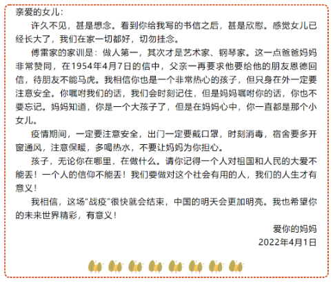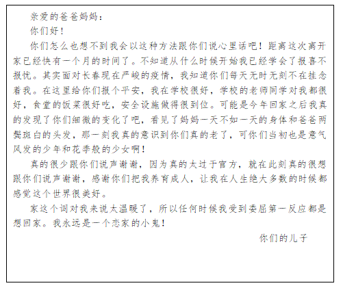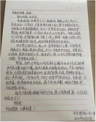 一封封信,云端传送诉说着对家的思念;一封封信,写满了牵挂和对平安的期盼;一封封信,架起了沟通的桥梁,凝聚起家校战“疫”爱的力量。