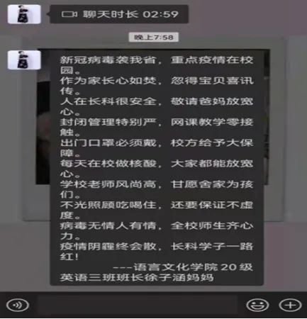 家住松原的语言文化学院20级英语三班班长徐子涵妈妈了解长科情况后,即兴赋诗一首:新冠病毒袭我省,重点疫情在校园,作为家长心如焚,忽得宝贝喜讯传,人在长科很安全……