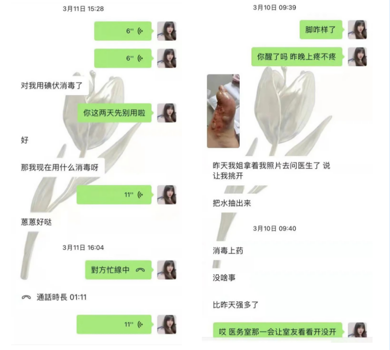 21级护理三班顾同学,因暖水瓶破碎导致脚二度烫伤,辅导员李起文知道后立即将她接到医院查看伤势,联系医生在线指导消毒减轻疼痛,时刻陪伴在学生身边,烫伤情况得到有效医治后,心底的石头才真的放下来。