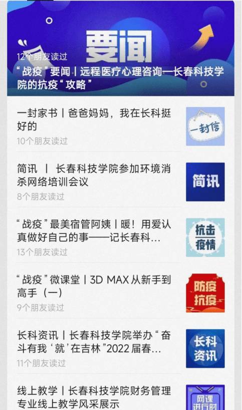 “孩子安全吗?”“上网课、做核酸、排查、隔离……”“成立远程医疗心理咨询服务组,开通远程医疗咨询服务通道”……针对大学生家长担心的孩子生命健康问题,长春科技学院充分发挥高校宣传窗口阵地作用,围绕家校打赢校园保卫战目标,把做好宣传工作作为家校共抗疫的桥梁和纽带,强化内宣外宣,打造线上线下互通有无的师生家长信息平台。统筹长科新媒体平台,构建网络宣传矩阵,通过新闻资讯、短视频、海报等加大内宣力度,回应家长关注关切。加强与各新闻媒体平台的沟通协作,充分展示长春科技学院校园抗疫外宣亮点。先后推出《筑牢“防护墙”,集聚打赢“底气”》《长春科技学院保质保量做好线上教学》《长春科技学院战“疫”党员突击队在行动》《云端课堂,“十八般武艺”亮眼》《来自长科两名学生家长的讲述》《长春科技学院:暖心救治获感谢》等报道宣传疫情防控经验做法、线上教学、暖心故事、特色举措,营造了万众一心抗击疫情的浓厚氛围,真实反映了长科在疫情防控中快速反应、有力坚决、紧密智控、高效协调的应急机制,让家长适时了解长科防疫情况,吃了“定心丸”。