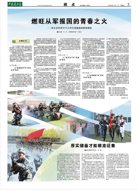 ——学生军训标兵连。2020年以来,部分地区的高校学生军训工作受到了疫情影响。但在吉林省,所有高校学生军训工作正常展开。吉林大学领导自豪地告诉记者:“近两年我校入学新生均超过1万人,军训工作全部由预备连承担。”记者了解到,各高校还结合军事课教学,在抓好军事理论学习的同时,通过集中开展学生军训和常态化军事训练活动,使大学生预备连成为学生军训的样板和标杆。