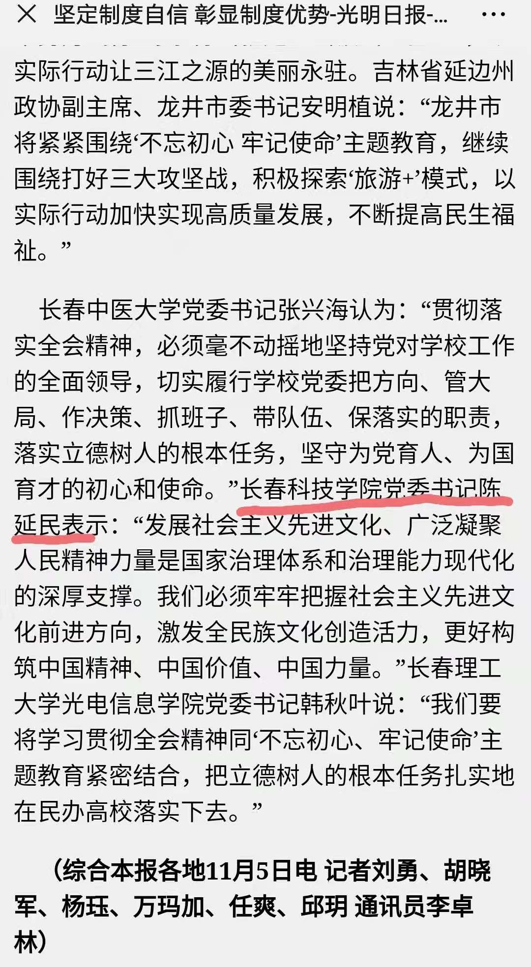 长春中医大学党委书记张兴海认为:“贯彻落实全会精神,必须毫不动摇地坚持党对学校工作的全面领导,切实履行学校党委把方向、管大局、作决策、抓班子、带队伍、保落实的职责,落实立德树人的根本任务,坚守为党育人、为国育才的初心和使命。”长春科技学院党委书记陈延民表示:“发展社会主义先进文化、广泛凝聚人民精神力量是国家治理体系和治理能力现代化的深厚支撑。我们必须牢牢把握社会主义先进文化前进方向,激发全民族文化创造活力,更好构筑中国精神、中国价值、中国力量。”长春理工大学光电信息学院党委书记韩秋叶说:“我们要将学习贯彻全会精神同‘不忘初心、牢记使命’主题教育紧密结合,把立德树人的根本任务扎实地在民办高校落实下去。”