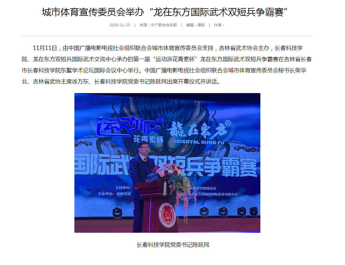 11月11日,由中国广播电影电视社会组织联合会城市体育宣传委员会支持,吉林省武术协会主办,长春科技学院、龙在东方双短兵国际武术交流中心承办的第一届“运动派花青素杯”龙在东方国际武术双短兵争霸赛在吉林省长春市长春科技学院东鳌学术论坛国际会议中心举行。中国广播电影电视社会组织联合会城市体育宣传委员会秘书长柴华北、吉林省武协主席徐万东、长春科技学院党委书记陈延民出席开幕仪式并讲话。