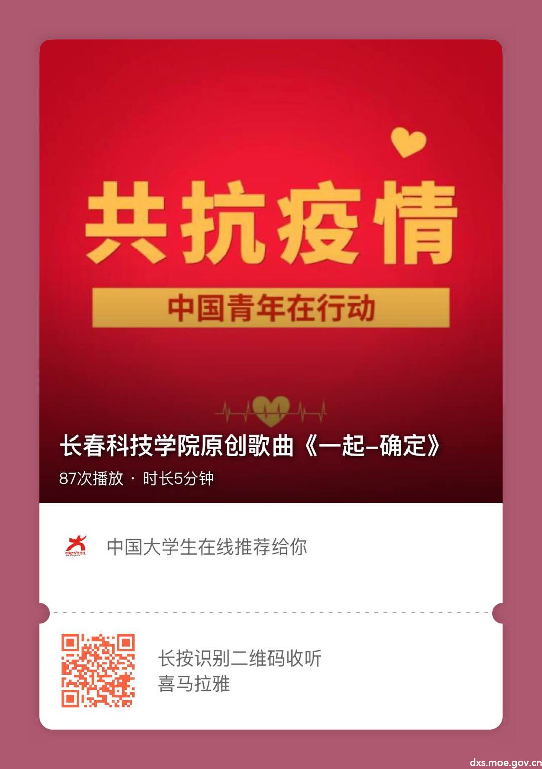 该词曲由长春科技学院团委书记李可心创作,谨以此歌献给坚守在防疫一线的抗疫英雄,也愿能以音乐的力量,为每一座城市里惴惴不安的人驱散阴霾。心系武汉,愿一起安好,我们“一起”。