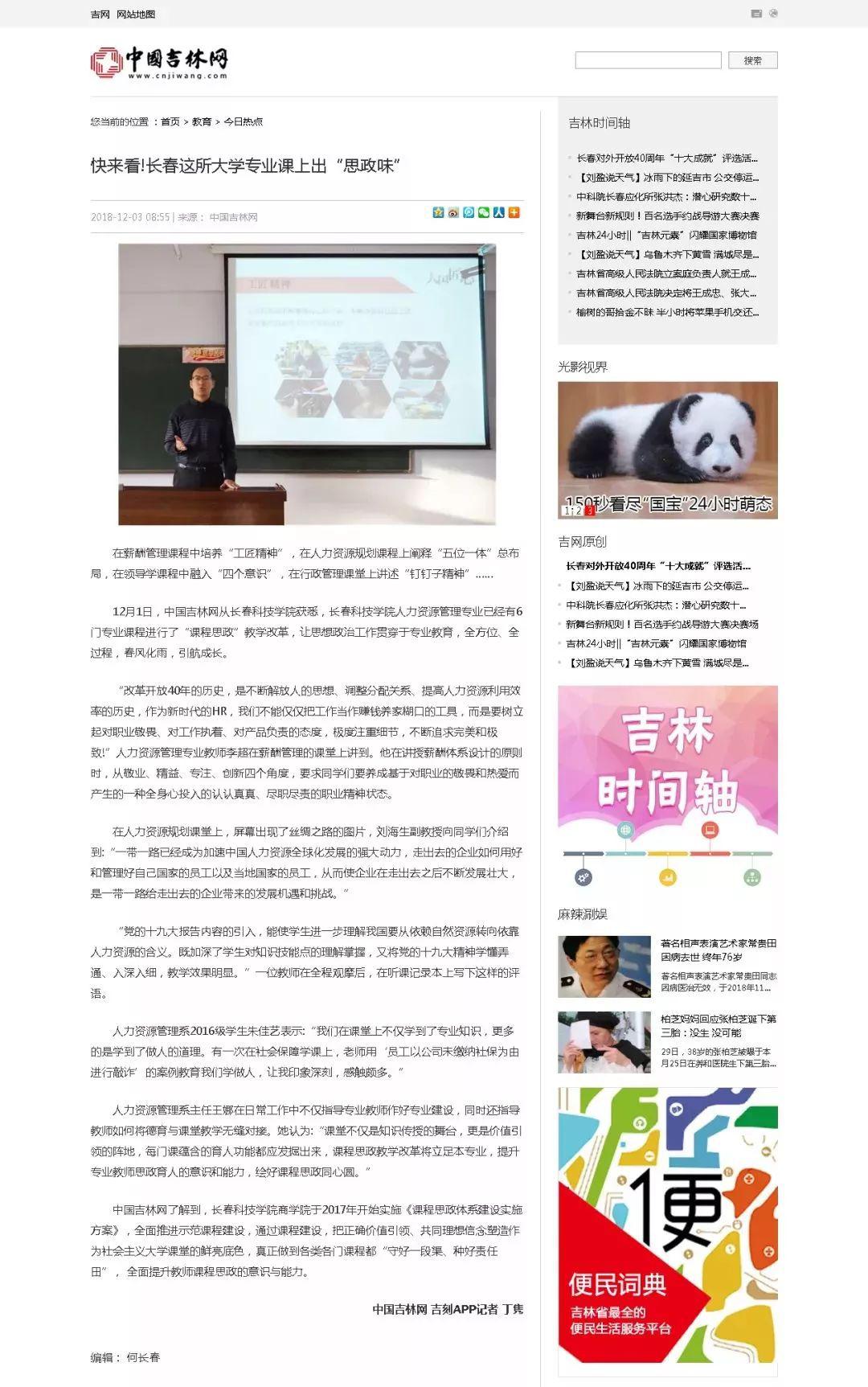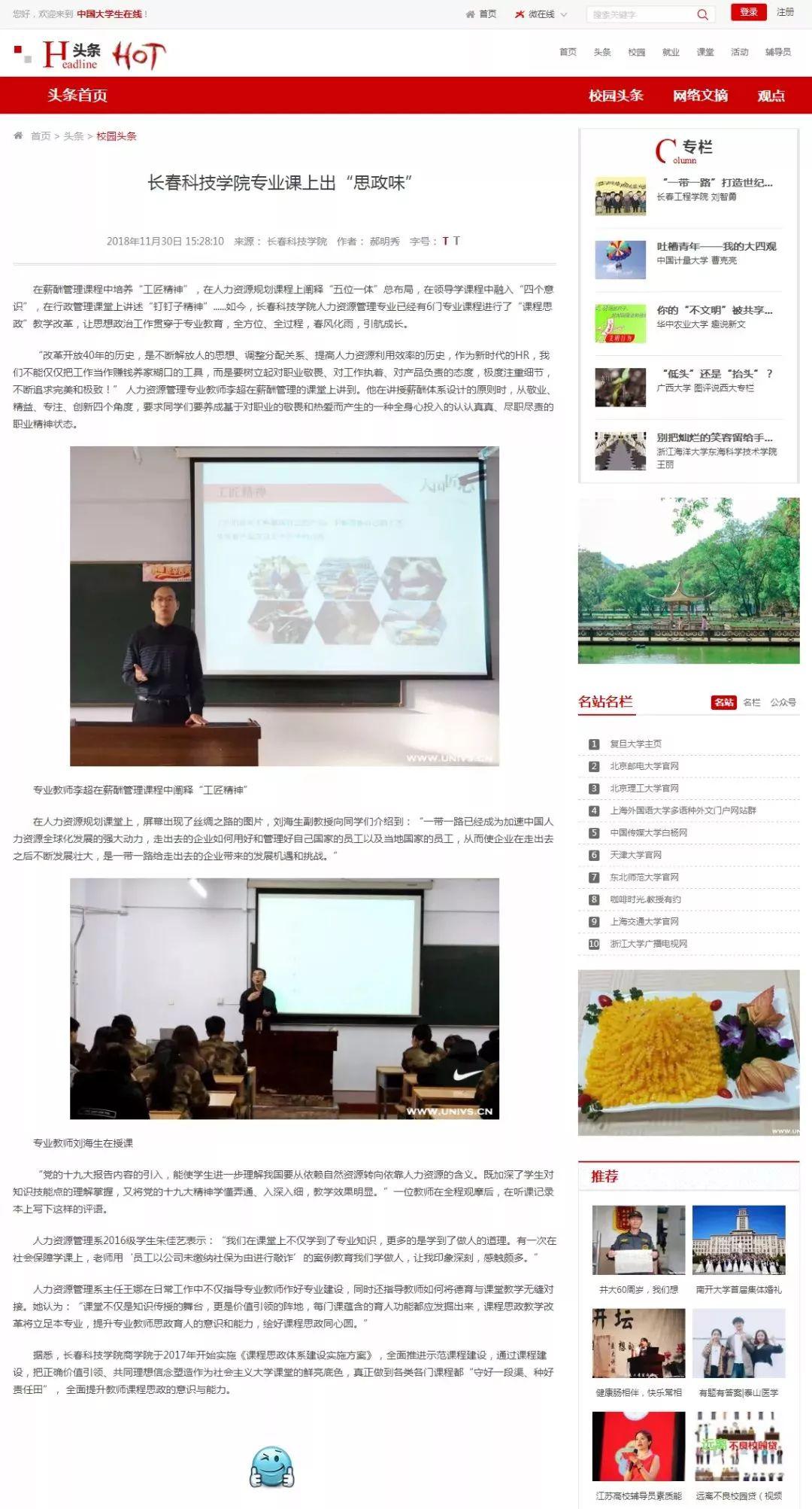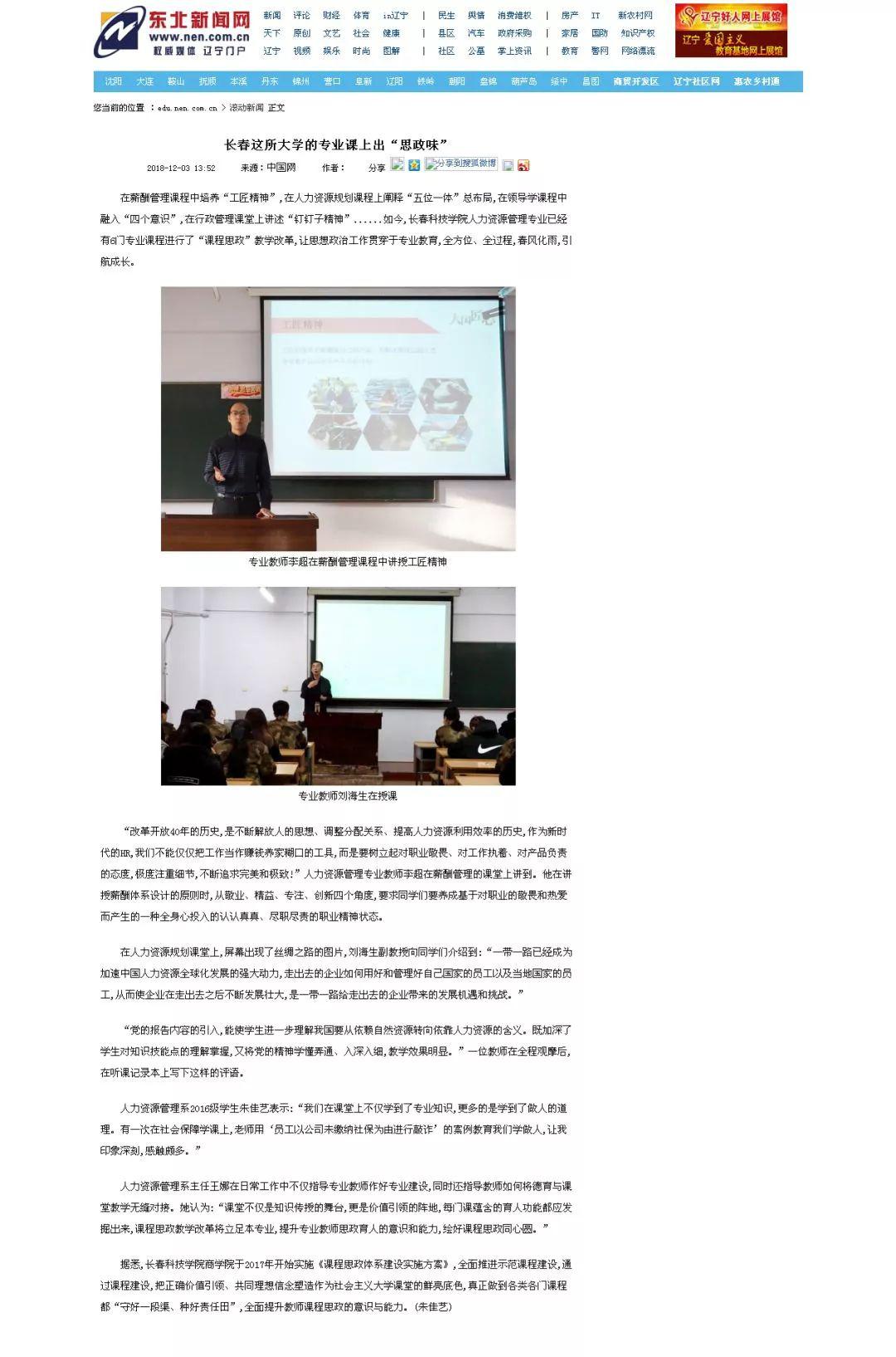 近日,教育部中国大学生在线、东北新闻网、中国吉林网等媒体关注报道了我校人力资源管理专业在“课程思政”的教学探索。