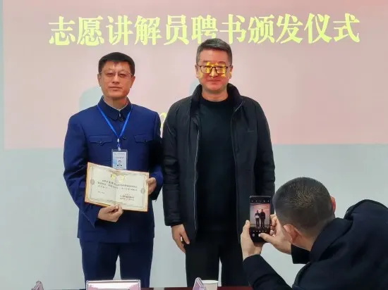 四川两弹城博物馆馆长刘风才为长春科技学院特聘思政课客座教授孟祥柱教授颁发四川两弹城博物馆志愿讲解员聘书