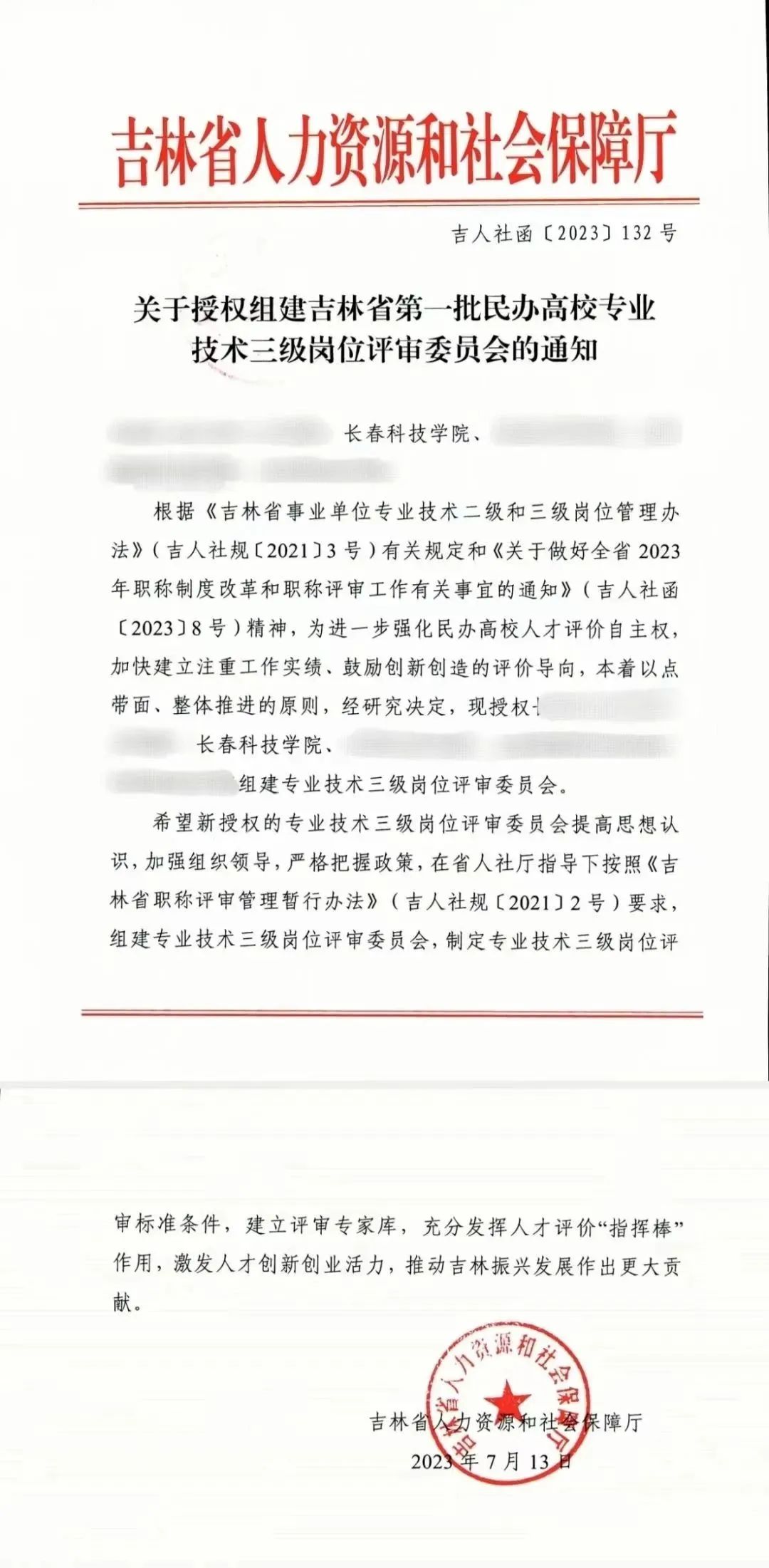 学校首次取得吉林省专业技术三级岗位自主评审权,是第一批被授予专业技术三级岗位自主评审权的民办高校,标志着专业技术人才职称晋升通道进一步拓宽,为推动学校队伍建设再上新台阶,提供强大支撑。