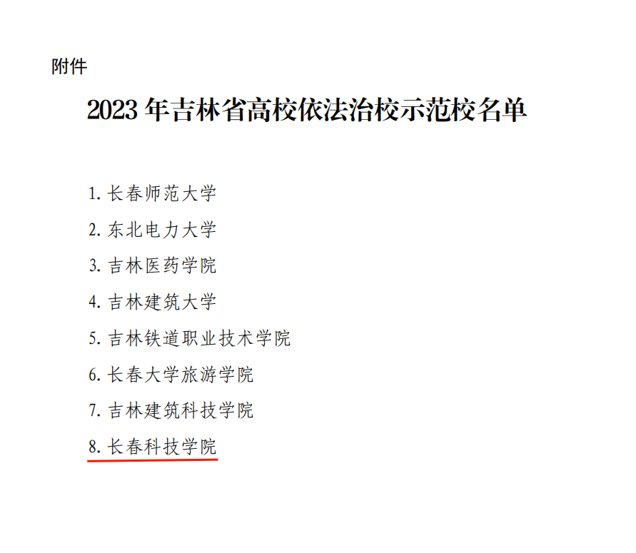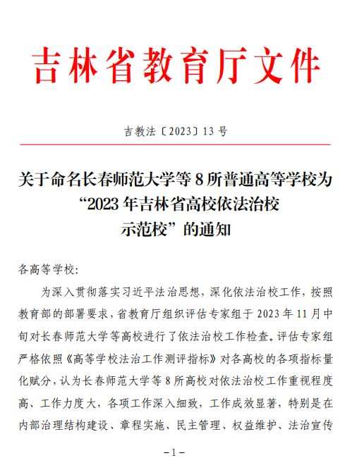 学校严格依照《高等学校法治工作测评指标》细化工作分工,在内部治理结构建设、章程实施、民主管理、权益维护、法治宣传等方面统筹推动各部门依法治校工作职责落实到位,高质量推进依法治校创建工作,被教育厅评为“2023年吉林省高校依法治校示范校”,体现了我校依法治校效果显著。