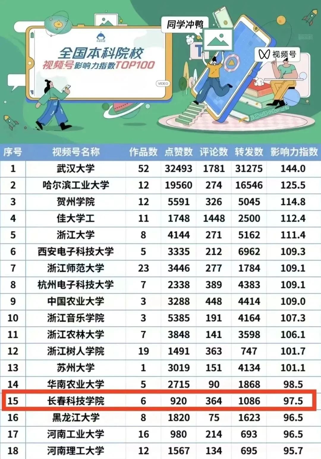 学校办学实力不断获得社会认可,连续四年被评为最受中学信赖及认可高校。学校视频号影响力全国排名第15名(吉林省第1名),2023年长春科技学院荣获“最具社会影响力本科高校”称号。