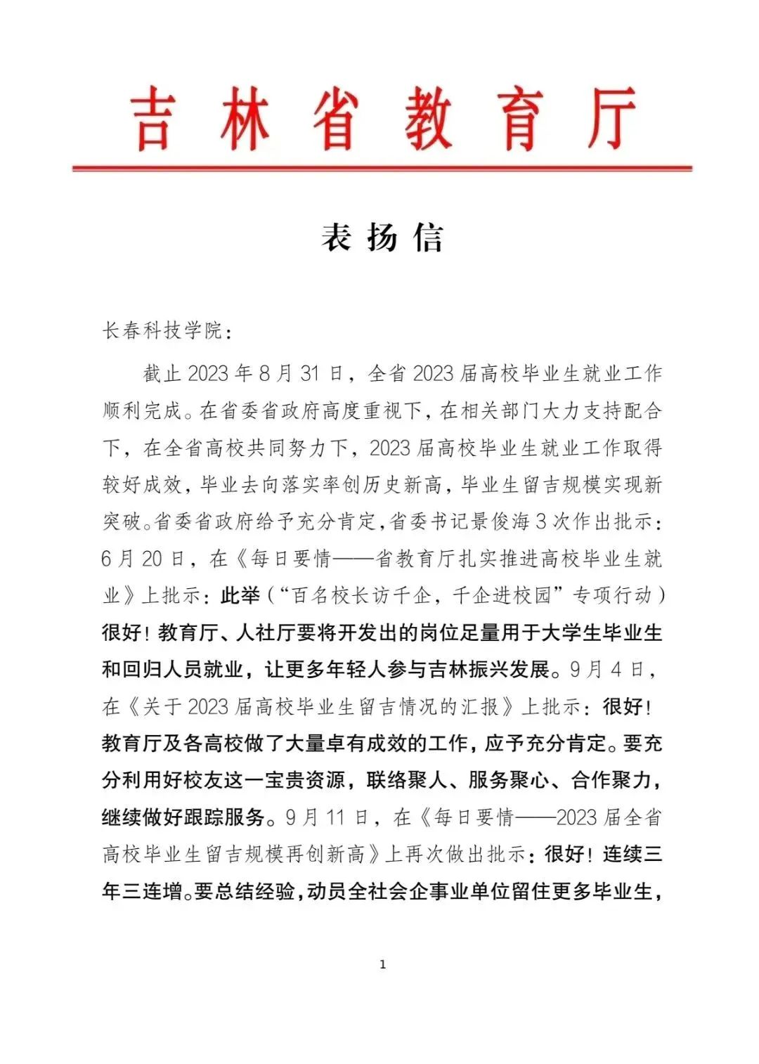 2023年,学校毕业生就就业工作受到吉林省教育厅通报表扬,连续二年获得吉林省留省就业工作绩效一等奖,被中国教育在线评为2023年高质量就业最佳服务高校。