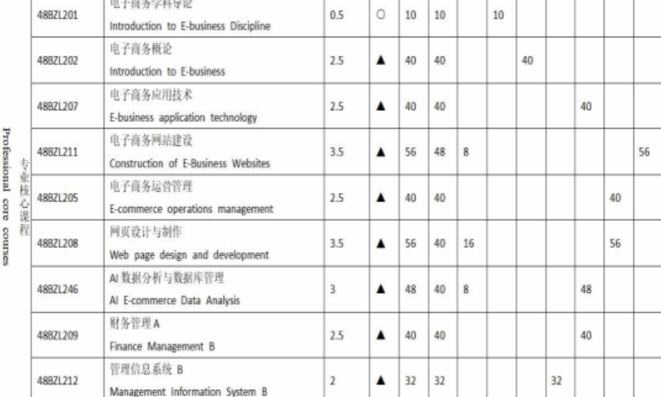 电子商务概论、电子商务应用技术、电子商务网站建设、电子商务运营管理、网页设计与制作、AI数据分析与数据库管理、跨专业综合实训。