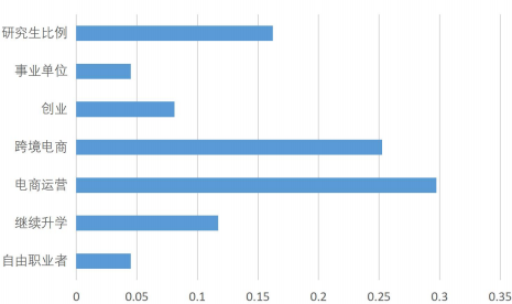 毕业后可在大中型企业单位从事电子商务文案策划、电商运营、网站建设、客户关系管理、多媒体视频创作等工作。选择继续求学深造或考取各级国家公务员与事业单位。研究生毕业后继续攻读博士学位的同学也都有很好的发展空间,如在企业担任重要职务,在高校成为骨干教师等。毕业生应届毕业薪资可达到3500-8000,随着工龄与技术能的提高,薪资提升空间较大。