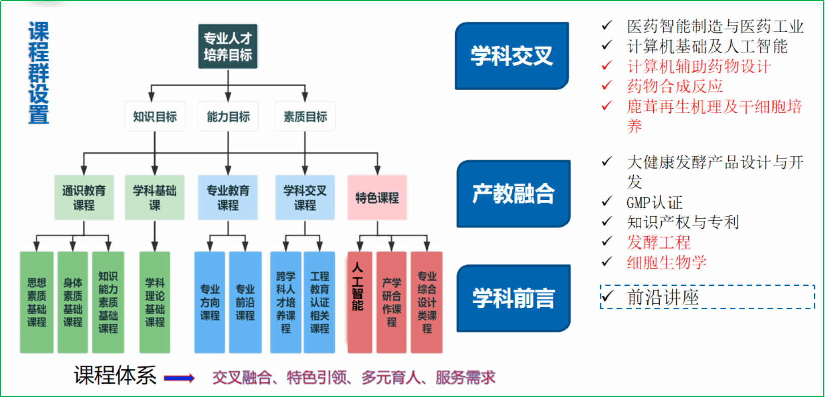 坚持以学生为中心,以提升工程应用能力及创新能力作为专业建设的出发点。以五大工程为生产技术,针对职业岗位和职业能力确定菌种筛选与鉴定;生物制品生产;发酵产物的提取与精制;药物制剂;药物分析与检测五项核心能力优化课程体系。与企业、行业联合培养,构建人才共育,专业共建,专业共管,课程共建,师资共享,发展共赢“六位一体”培养模式。实现教学组织形式从“教师主导、课堂情境”向“多方协同、应用情境”的转变。通过“学赛、学研、学用、学创”的四个结合将专业竞赛、科学研究、社会实践、创新创业实践全面融入人才培养方案,从知识体系、职业素养、应用创新能力“三个维度”完善人才培养体系。构建“厚基础、强实践、重素质”三位一体的应用型人才培养体系。培养理论基础扎实,工程素质优良,实践创新能力强的高素质应用型人才。成为最具就业竞争力生物制药及大健康制品行业的卓越工程师。