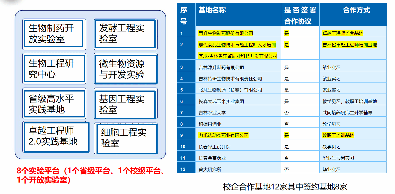 生物工程专业共8个专业实验平台,其中省级实践平台1个、省级拨款建立的校级平台1个、生物制药开放实验室1个。校企合作基地12家其中签约基地8家其中,深度合作基地三家,分别为卓越工程师培养基地-惠升生物制药股份有限公司,吉林省卓越工程师培训基地-吉林省东鳌鹿业科技开发有限公司,教职工培训基地-力旭达动物药业有限公司。以上教学平台满足学生实践与教师培养。