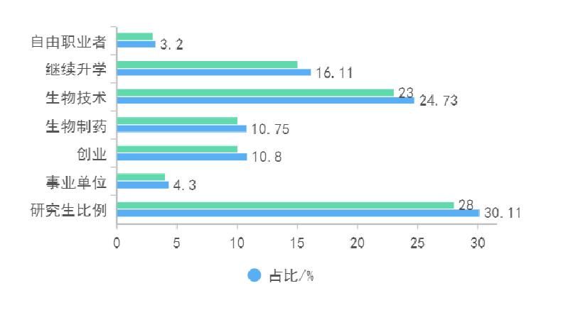 近三年毕业生去向,其中考取研究生比例占30.11%,事业单位占比4.3%,创业者占比10.8%,生物制药岗位占比10.75%,生物技术相关企业占比24.73,继续深造升学,考公务员占比16.11%。从事生物工程相关行业100%。