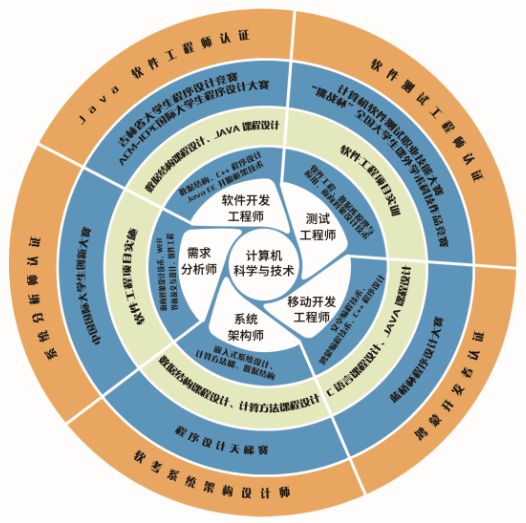 课程体系包括专业基础理论课和专业方向选修课两类。专业基础理论课程有高等数学计算机组成与结构、操作系统原理与应用、计算方法、离散数学、数据结构、计算机图形学、软件工程、面向对象设计技术、C程序设计、H5+JS、信息系统分析与设计、数据库原理与应用等;专业方向选修课程包括网络应用系统开发技术(Java方向和.Net方向)课程、移动开发技术(App开发、微信公众号开发、微信小程序开发)课程、前端UI开发技术(JS、VUE、H5等)课程、和系统维护(数据库管理、应用系统维护、软件测试技术)课程等。