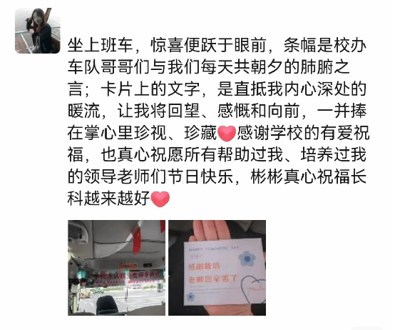 这份藏在班车上的“小惊喜”,是党政办公室践行服务初心、传递学校关怀的生动体现。从条幅装饰到贺卡准备,再到语音祝福,每一个细节都凝聚着对教师们的尊重与关爱,不仅为教师们的通勤路增添了仪式感,更让大家在节日当天收获了满满的幸福感。