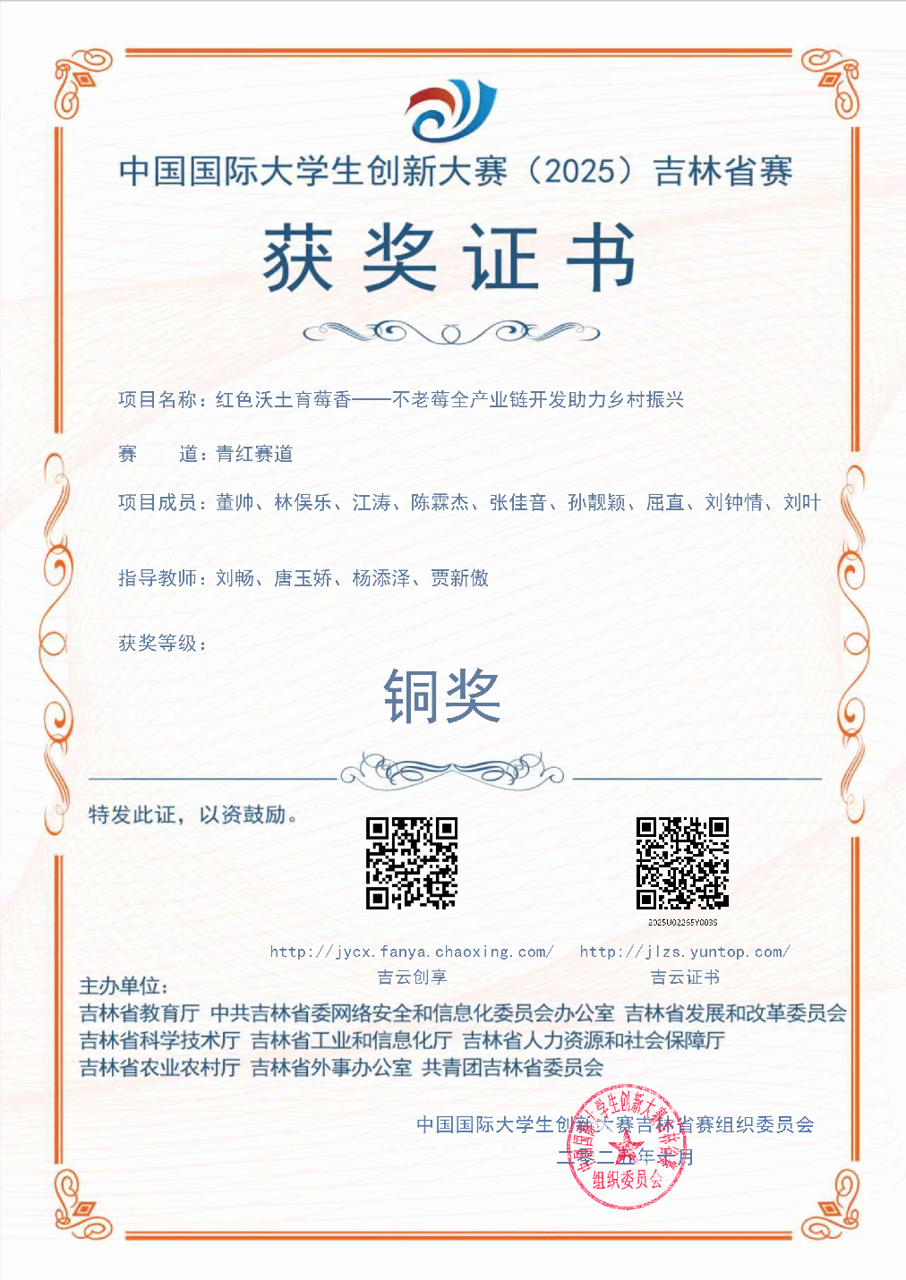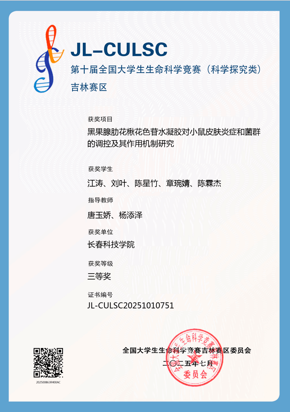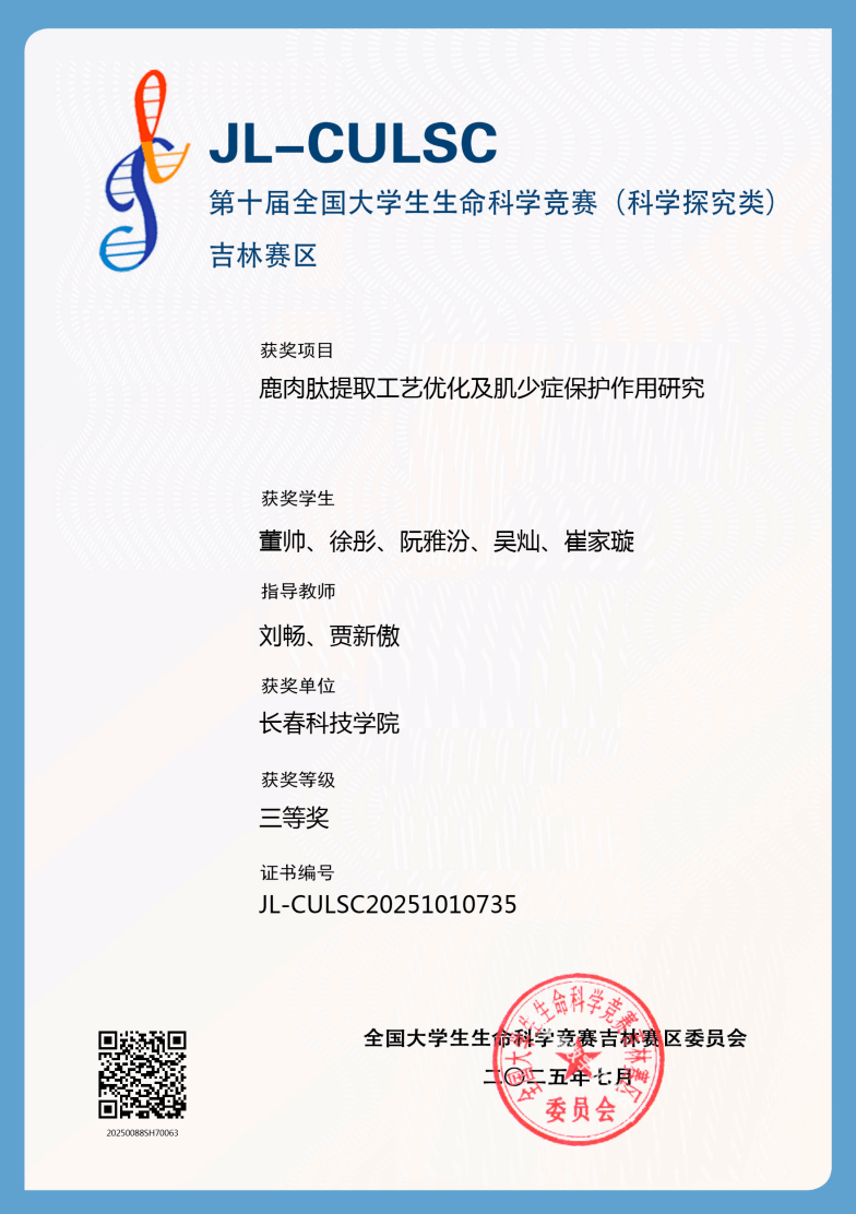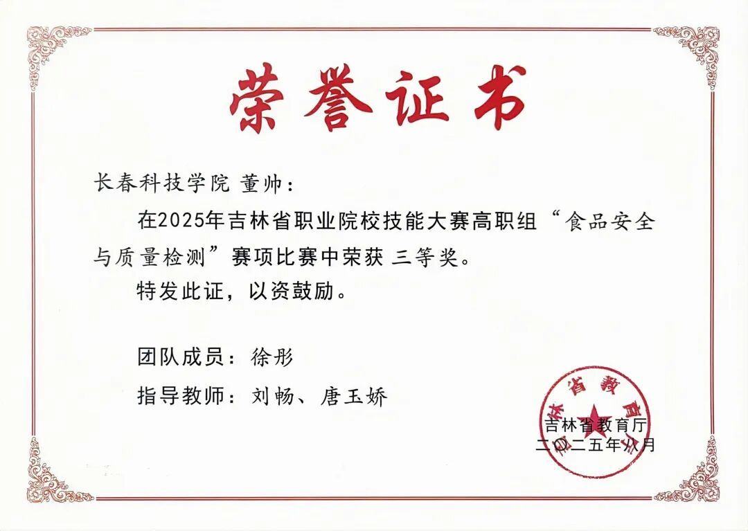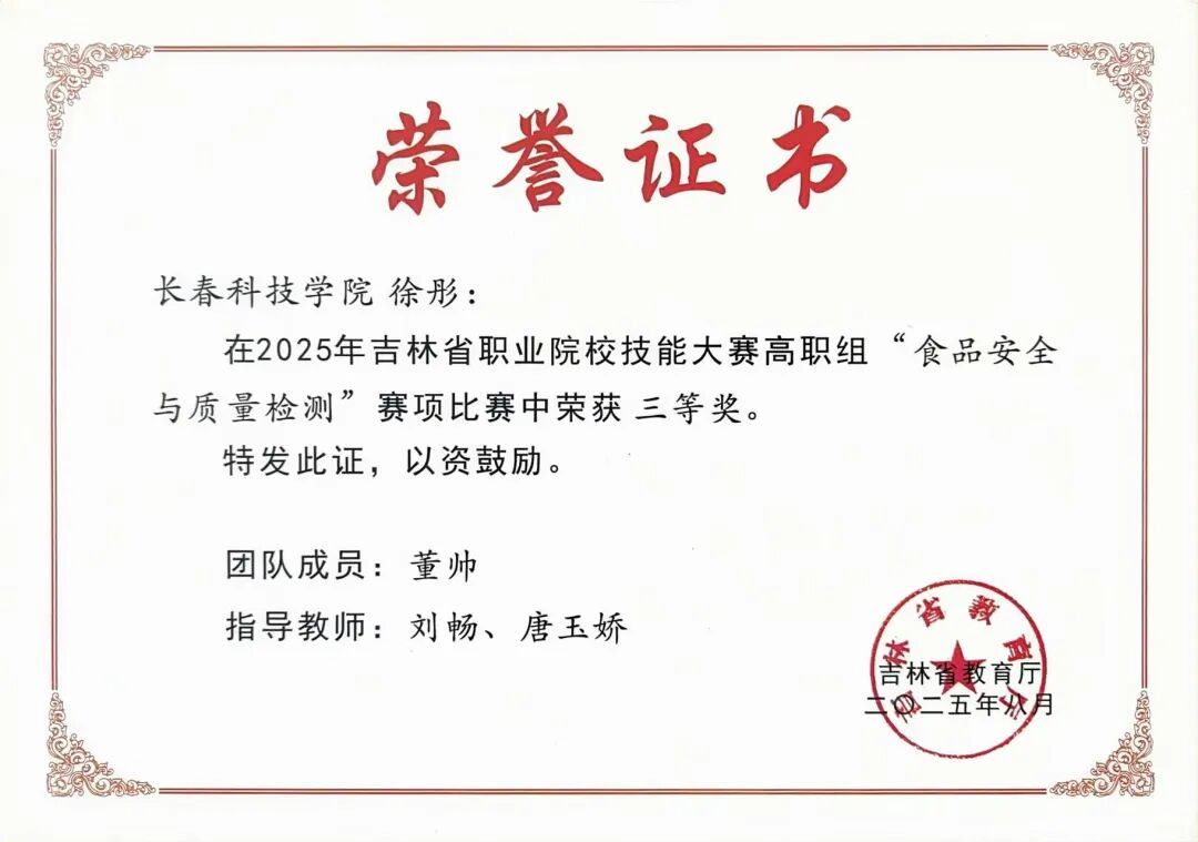 在2025年吉林省职业院校技能大赛 “食品安全与质量检测”赛项中,刘畅和唐玉娇老师指导学生成果取得省级三等奖,进一步拓展了人才培养的应用维度,强化了学生实践能力与岗位适配度。
