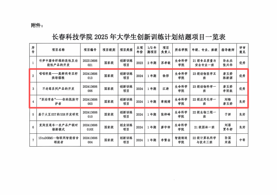 全年共有多项国家级、省级大学生创新创业训练计划项目及高教科研课题顺利结项,涵盖鹿产品加工、功能食品开发、乡村振兴与科普教育等方向,形成了一批可持续推进的成果储备。