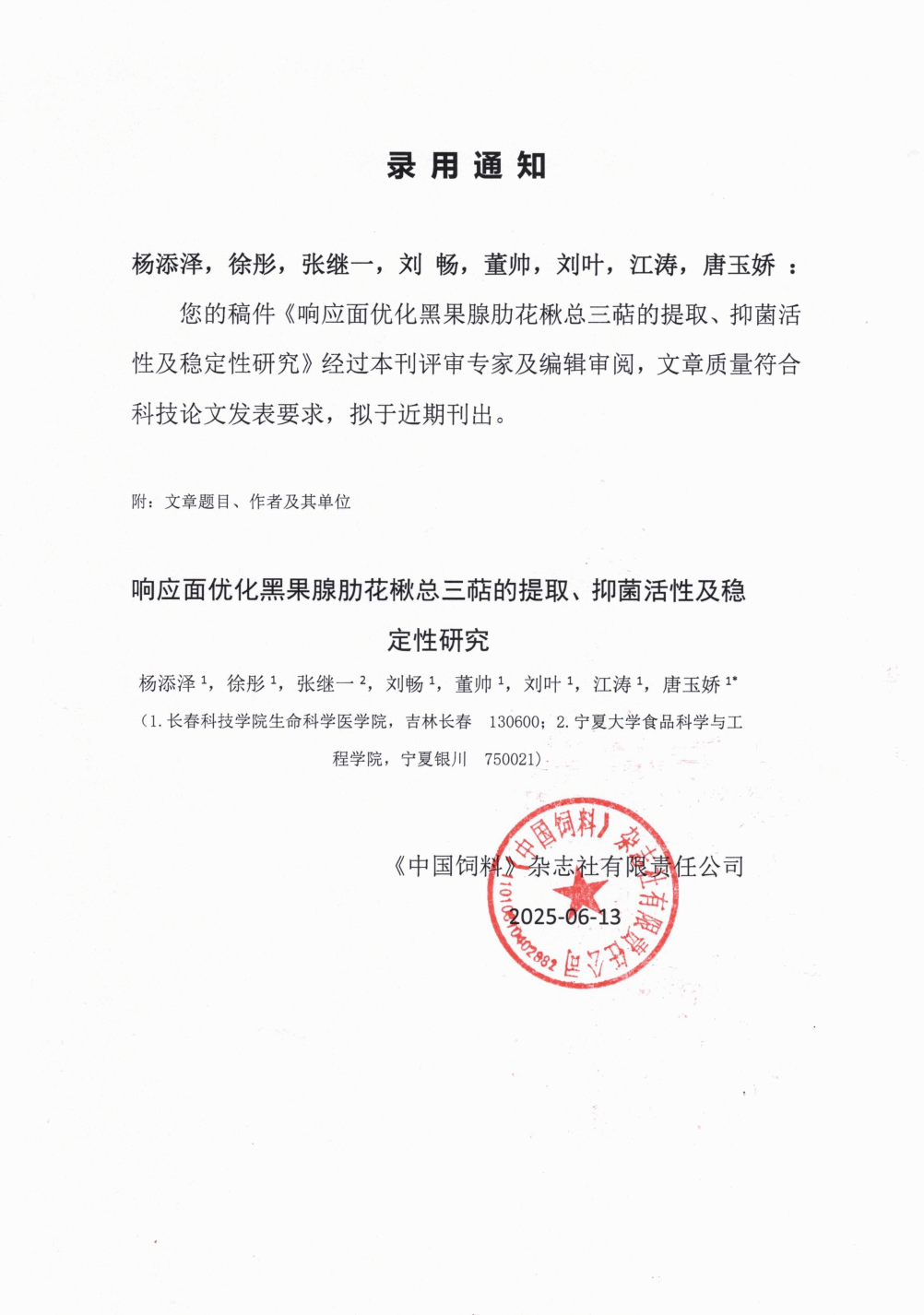 2025年,研究院与吉林农业大学食品科学与工程学院联合培养硕士研究生两名,人才培养质量不断提升,为研究院可持续发展夯实了后备力量。