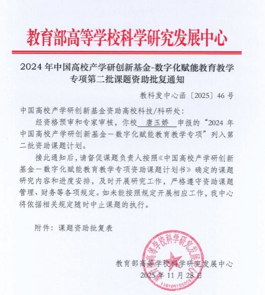 学校持续深化政产学研用协同创新,产学研融合成效不断显现。围绕服务地方产业发展和乡村振兴战略,学校形成的多项决策咨询成果获得省级领导肯定性批示,实现了科研成果向现实生产力和产业需求的有效转化。在此基础上,学校不断拓展与行业龙头企业的合作深度,与华大细胞共建联合实验室,围绕鹿茸干细胞研究、技术开发和成果转化开展协同攻关,推动鹿茸产业与基因细胞技术跨界融合。依托重点产学研项目实施, 唐玉娇教授主持的“ 人工智能赋能梅花鹿养殖 ”课题成功获批教育部《2024年中国高校产学研创新基金—数字化赋能教育教学专项》,实现该类项目立项突破。随着产学研合作不断深化, 全年合作开展横向科研课题9项,进一步夯实了学校服务产业发展和科技成果转化的实践基础。