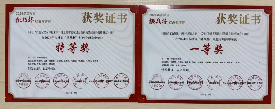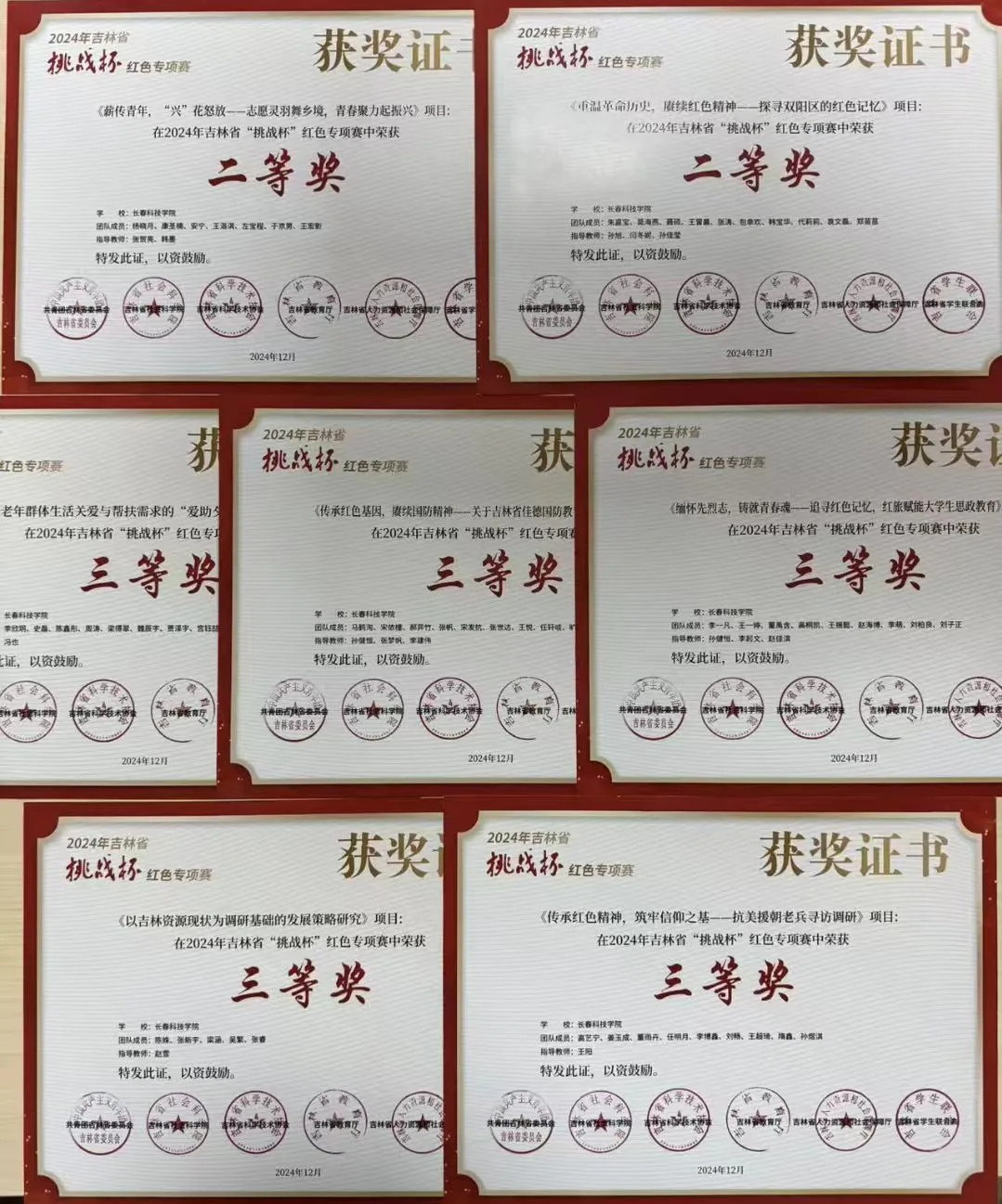 近日,共青团吉林省委发布了2024年吉林省“挑战杯”竞赛“红色专项”活动的通报,我校喜获佳绩,共荣获特等奖1项,一等奖1项、二等奖2项,三等奖5项。