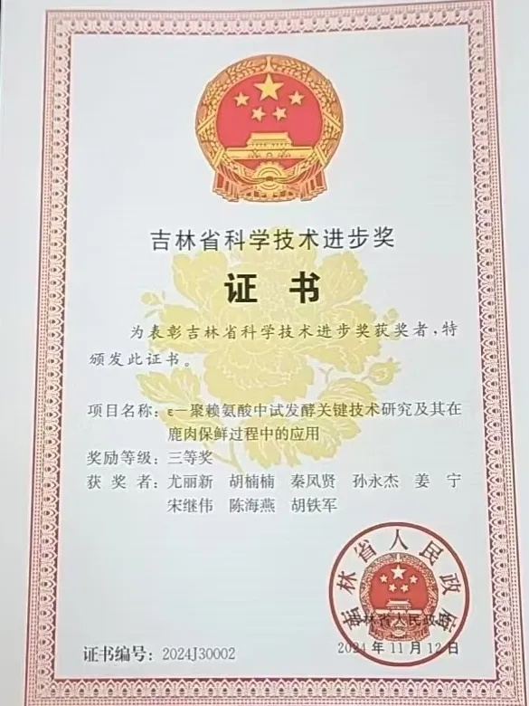 (一)尤丽新教授团队《ε-聚赖氨酸中试发酵关键技术研究及其在鹿肉保鲜过程中的应用》项目荣获吉林省科学技术进步奖三等奖;
