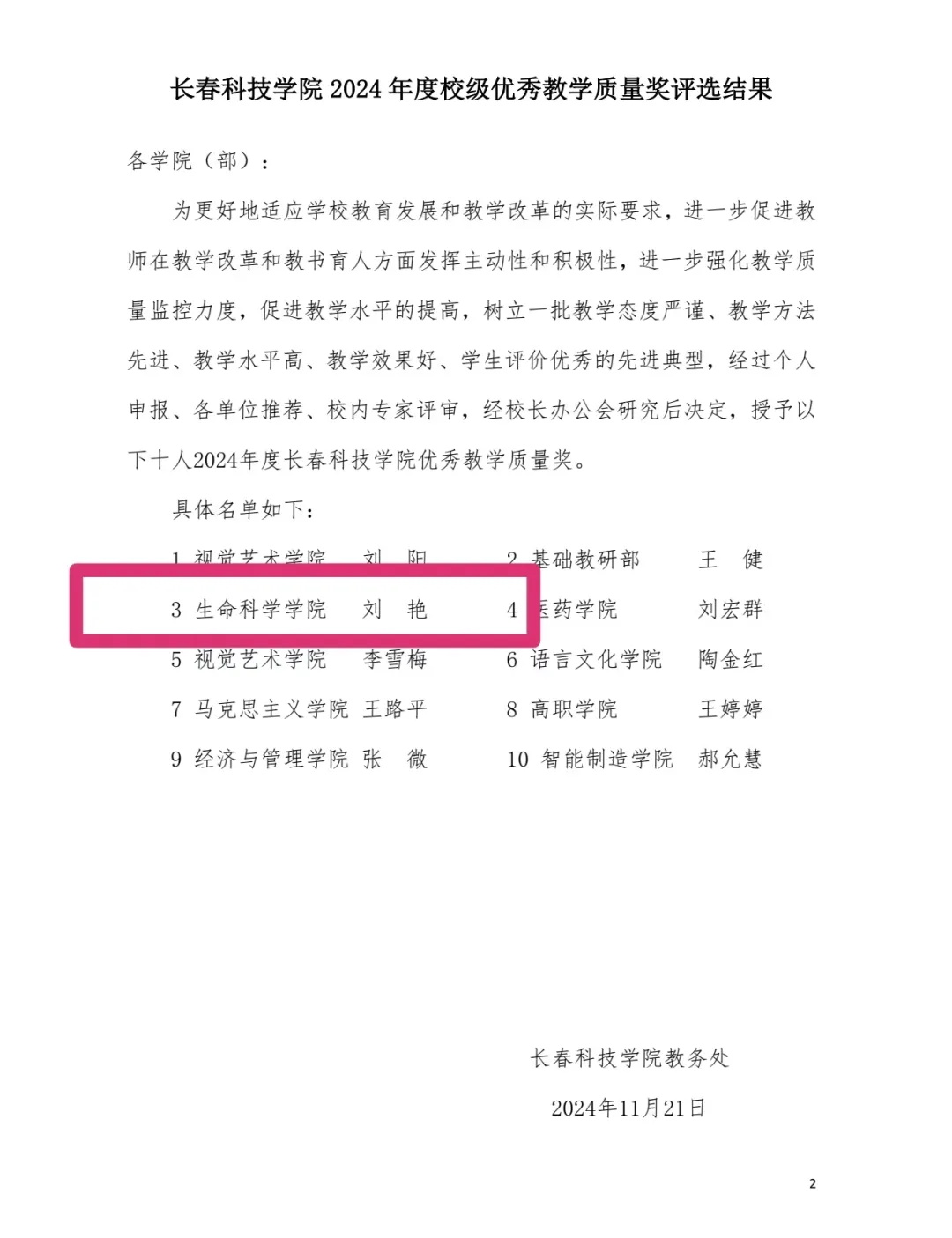 (三)刘艳教师获得2024年度校级优秀教学质量奖1项;