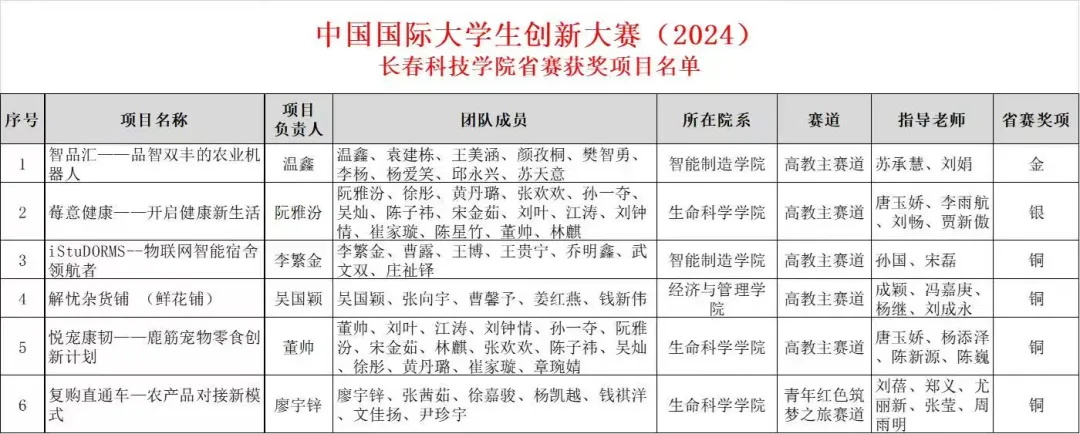 (三)尤丽新、唐玉娇、陈巍、刘蓓、郑义、刘畅、贾新傲、陈新源、李雨航、杨添泽、张莹十一位教师指导学生参加中国国际大学生创新大赛分别获得吉林省银奖1项、铜奖2项;