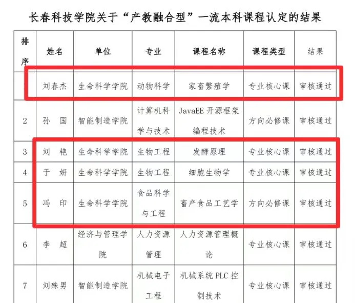 (一)姚贵哲教师主讲的《兽医寄生虫及寄生虫病学》、陈贝妮教师主讲的《兽医传染病学》、刘艳教师主讲的《发酵原理》、刘春杰教师主讲的《家畜繁殖学》、冯印教师主讲的《畜产食品工艺学》、于妍教师主讲的《细胞生物学》获批“长春科技学院产教融合型一流本科课程”。
