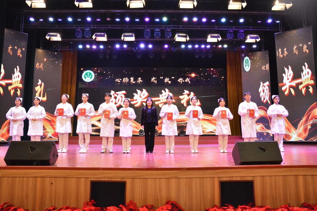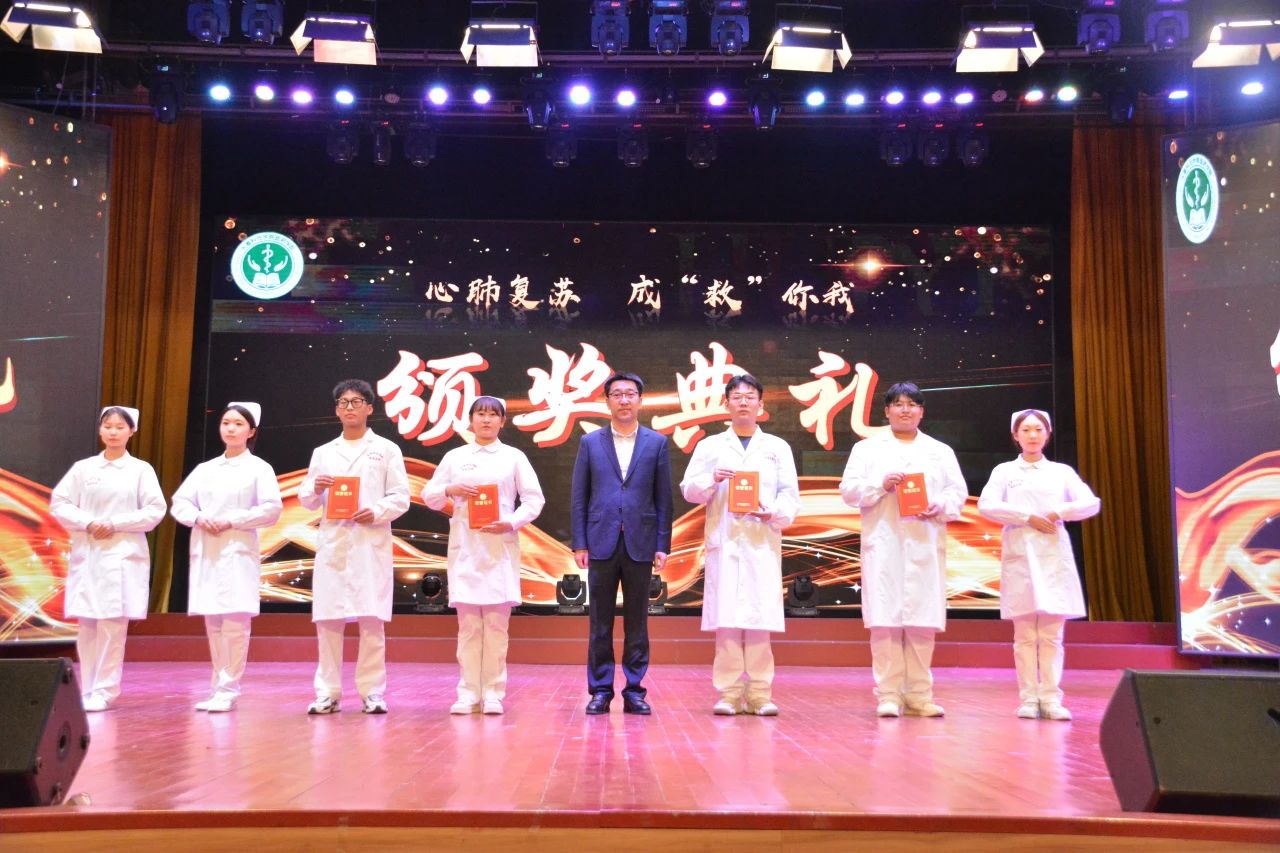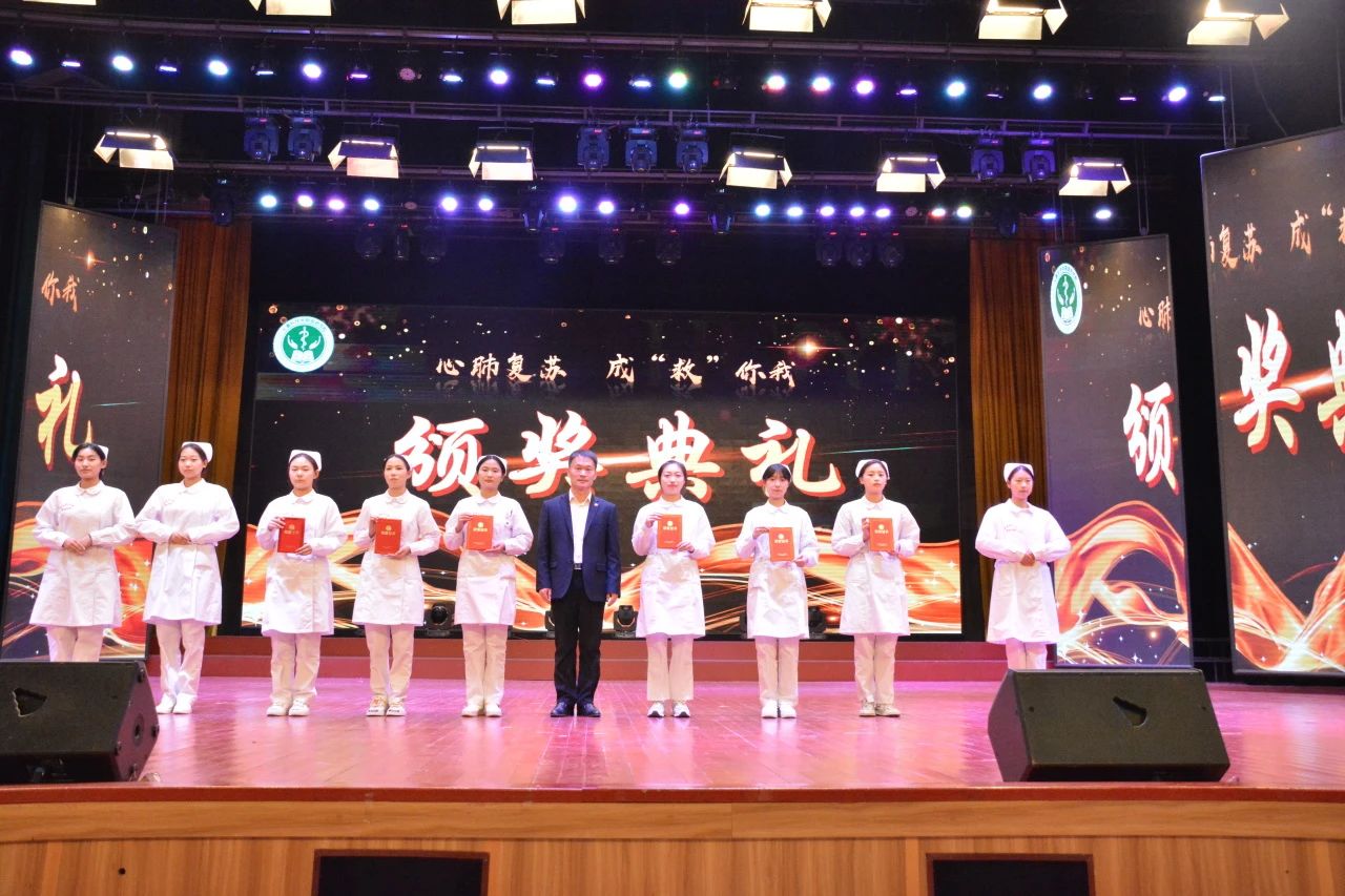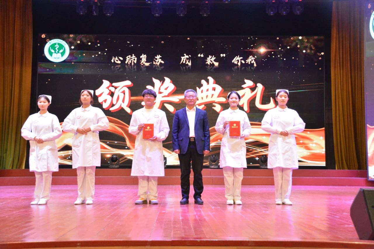 与会领导为“心肺复苏大赛”获奖同学颁奖。