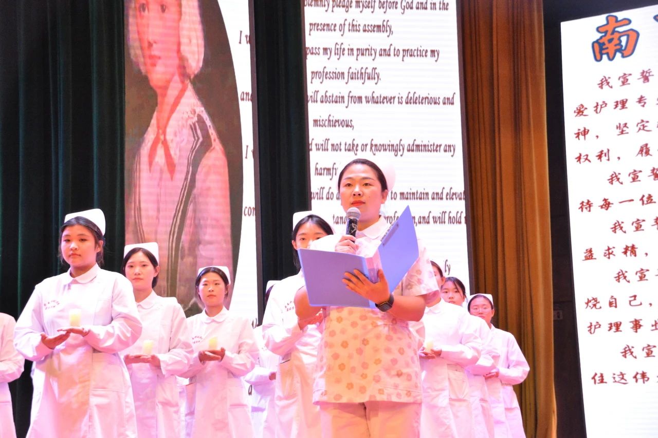随后,伴随着舒缓旋律的指引,传光授帽仪式正式开始。学生代表依次上台,手捧护士帽,走到老师们面前单膝跪地,低头接受授帽。传光授帽完毕,在刘影老师的领誓下,高举右拳,用铿锵有力的声音,庄严宣誓《南丁格尔誓言》,高颂护理人员的从业初心与使命担当!